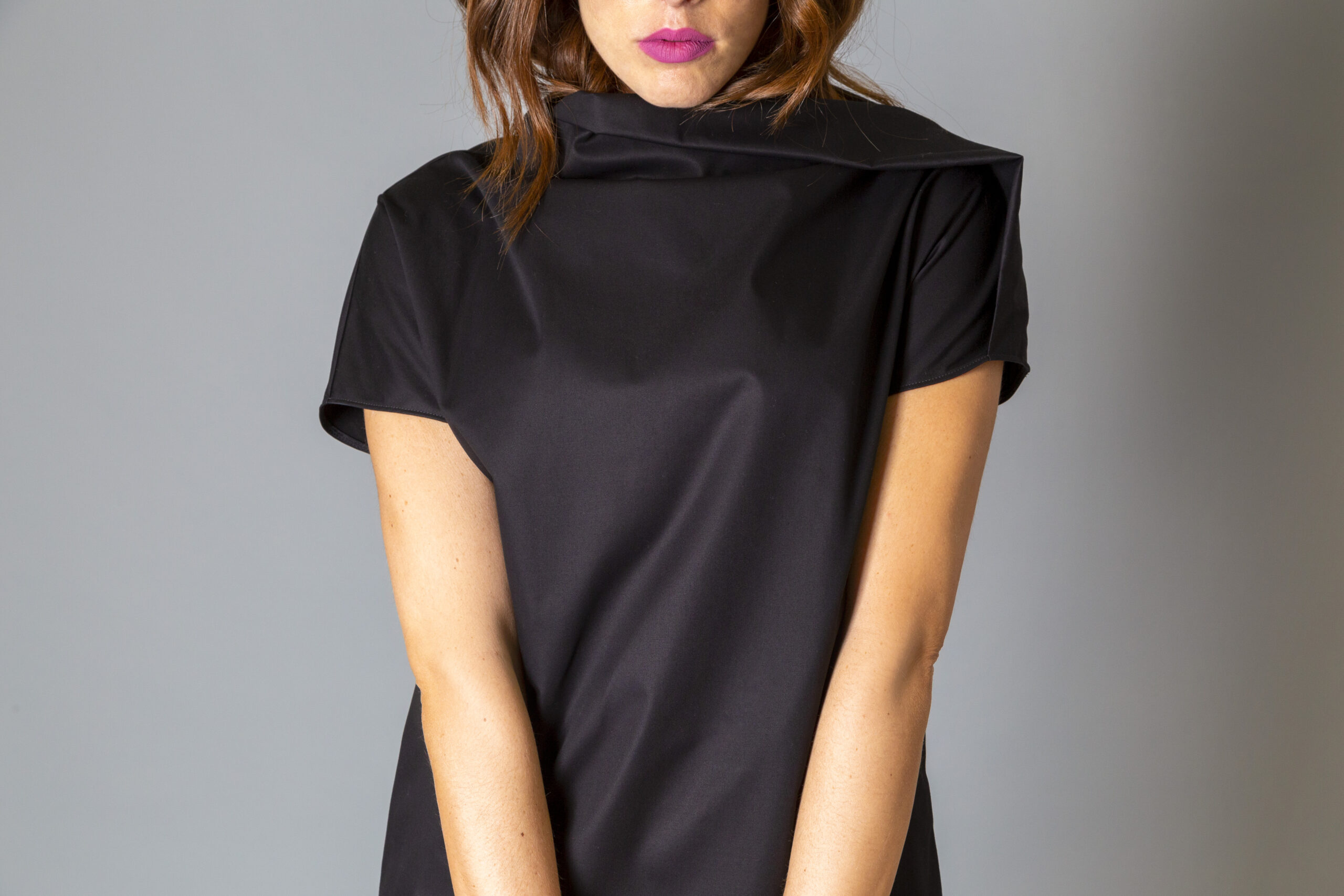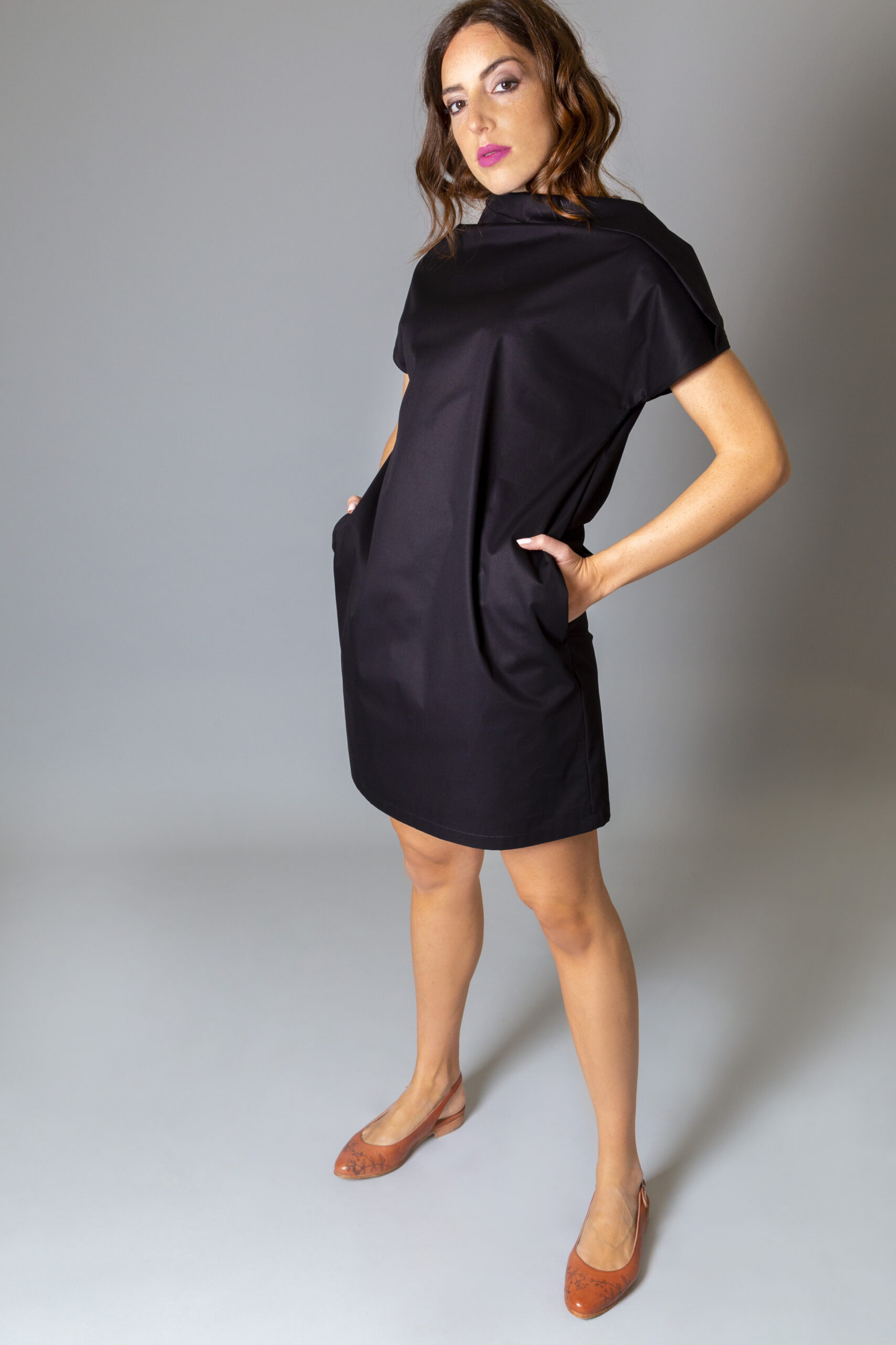 Abito gabardine 100% cotone dal collo strutturato, linea dritta, tasche laterali.